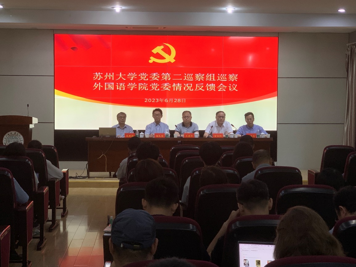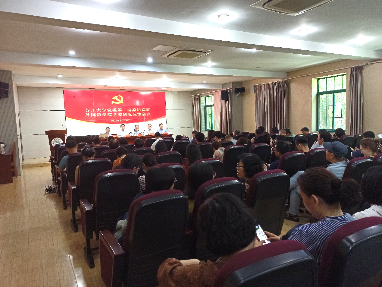 2023年6月28日,苏州大学党委第二巡察组巡察外国语学院党委情况反馈会议在崇远楼201召开。校党委副书记、第二巡察组组长王鲁沛,校党委常委、纪委书记、派驻监察专员、校党委巡察工作领导小组副组长宫向阳,第二巡察组副组长、物理科学与技术学院党委书记、基础教育管理办公室副主任杨礼富以及第二巡察组的全体成员出席了会议。外国语学院党委书记严冬生主持会议。
