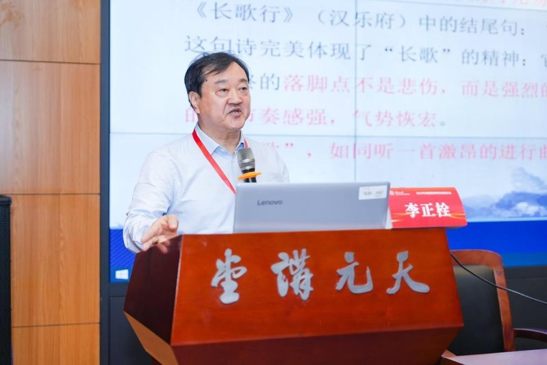 主旨发言环节名家云集,12位学界领军人物带来高水平学术分享。河北师范大学李正栓教授以《乐府〈长歌行〉译者行为比较研究》为题,通过分析安妮・比雷尔与宇文所安的英译本,揭示西方译者在文化重构与哲理传递中的不同侧重。