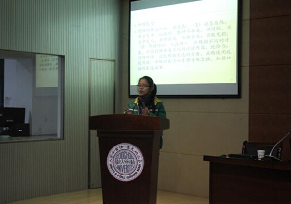 为了帮助英语专业同学提高英语口语能力,我院于12月17日晚在崇远楼口译实训室举办了“英语专业本科学习指导系列讲座之三――如何提高英语口语能力”专题讲座。此次讲座由我院演讲辩论社指导老师、有着丰富英语口语训练经验的杨志红博士主讲。学院2014级英语班、英语师范班、翻译班、俄英双语班以及法英双语班的同学们参加了此次讲座。