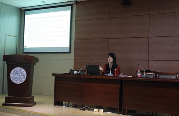 杨老师指出,听、说、读、写、译是外语五大基本技能,分为接受性技能和产出性技能。她认为,在学习一门外语的不同阶段,既要兼顾所有技能,同时也要有所侧重,这样才能更高效地学习语言。随后,她根据自己的教学经验给大家介绍了英语口语中常见的问题,并指出在英语交际过程中,在不同的场合要有不同的表达方式,例如:跟同辈的日常交往,跟老师、长辈的交往,在交互性较强的情境中就某一话题表达观点及在辩论赛或者演讲中,都应选择恰当的表达方式,使自己的表达更有力、更地道、更有礼貌。然后,她给同学们介绍了国内外著名的英语演讲比赛,希望同学们在实战中提高自己的英语口语能力。