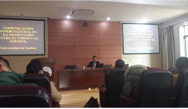 2014年12月29日,北京外国语大学西葡语系主任、北京市教学名师刘建教授来我院讲学,讲座的题目是 “文化差异与翻译信息的得失”。 我院西班牙语专业师生和西班牙语二外学生聆听了本次讲座。