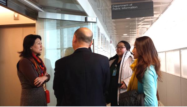 近日,联合国前秘书长科菲・安南的副发言人江华女士也前往看望了在新闻部的实习生,并与大家进行了亲切交谈。江华女士是联合国首位华裔新闻发言人,曾在英国BBC广播公司工作。江华女士询问了许斐然同学的实习情况,也对她提出了希望。