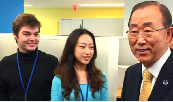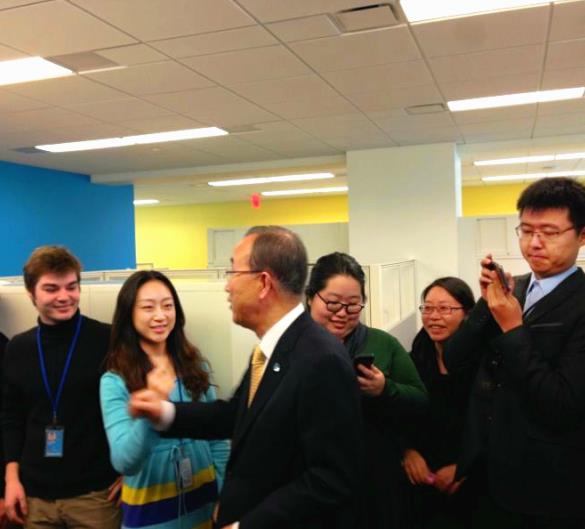新年伊始,我院硕士研究生许斐然同学赴纽约联合国总部实习进程刚刚过半,从埃博拉疫情较为严重的非洲地区返回纽约的联合国秘书长潘基文前往联合国新闻部给职员们拜年,期间,他亲切地接见了我院在新闻部实习的许斐然同学等众实习生。潘基文表示,自己刚从非洲回来,所以不用平常方式跟大家一一握手,而是以互击小臂的方式向大家表示问候,祝大家2015新年快乐。新闻部代理副秘书长也随行向大家祝贺新年。
