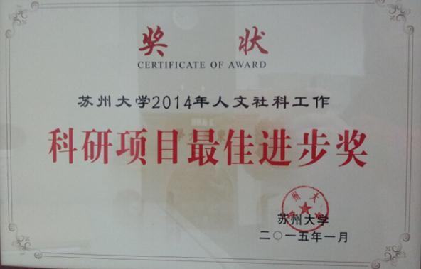 此外,2014年度,黄爱军等多位教师在国外SSCI和A&HCI源期刊上发表研究论文,赵爱国和王腊宝教授等的研究成果获江苏省社科二、三等奖;袁影、王军、赵爱国、施晖、宋艳芳、李明和王腊宝等老师获2014年苏州市第十二次哲社优秀成果奖和江苏省第九届高校哲学社会科学研究优秀成果奖;季小军获“俄罗斯文艺”文学翻译奖•“第六届全球俄汉翻译大赛”三等奖。