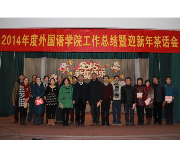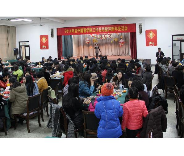 硕果累累辞旧岁,欢歌阵阵传祝福!2015年1月29日下午,外国语学院在东吴饭店大礼堂举行了“2014年外国语学院年终工作总结暨迎新年茶话会”。迎新茶话会由英语系莫俊华博士和西班牙语系沈晨老师共同主持。学院领导班子全体成员及学院全体教职员工悉数到会,大家欢聚一堂,辞旧迎新。