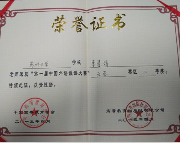 近期,我院翻译系束慧娟老师的专业综合/读写课程“Development by Space”的微课视频在由高等教育出版社举办的 “第一届中国外语微课大赛”中获得江苏赛区二等奖。