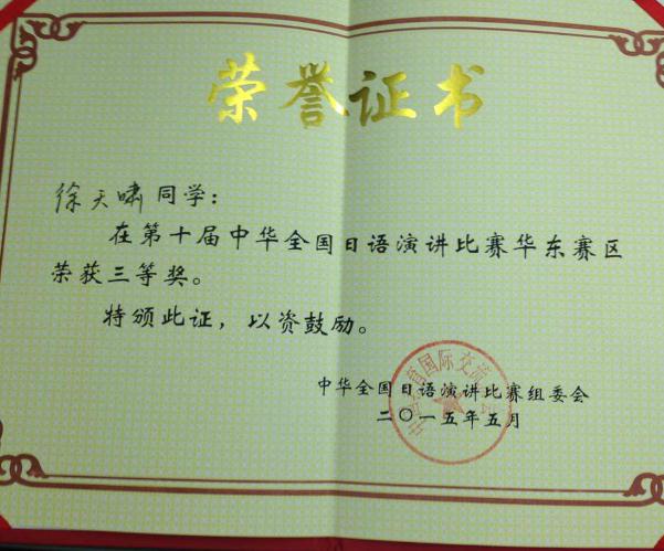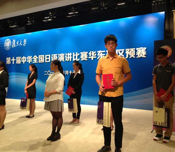 2015年6月13日,由中国教育国际交流协会、日本经济新闻社、日本华人教授会议联合主办的“第十届中华全国日语演讲比赛华东赛区预赛”在复旦大学光华楼东辅楼202吴文政报告厅举行,来自华东地区上海、浙江、江苏、江西三省一市的高校,除了我校还有复旦大学、上海交通大学、上海外国语大学、浙江大学、南京师范大学、江南大学、南昌大学等共21所大学的日语系学生参加了本次比赛,我院日语系三年级徐天啸同学获得三等奖,潘文东老师获得优秀指导教师奖。