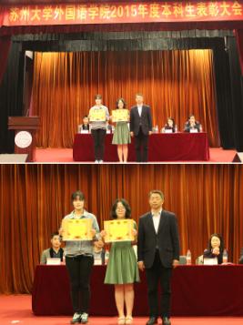 4月20日晚,苏州大学外国语学院2015年度本科生表彰大会在本部敬贤堂隆重举行。出席此次大会的领导有外国语学院院长王腊宝教授、党委书记王欣老师、副院长孙倚娜教授、副院长朱新福教授、副院长刘海鸿老师,以及本次大会的特邀嘉宾学校国际合作交流处的陆惠星副处长。此外,与会老师还有学院各系主任、2015级班主任、外国语学院院长助理王宇老师、外国语学院办公室主任蒋莲艳老师、全体辅导员。获奖学生、2012级、2013级、2014级各班班委以及2015级全体同学也参加了大会。本次大会由院党委副书记、副院长胡海峰老师主持。