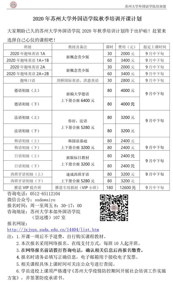 2020年苏州大学外国语学院培训部秋季培训开课计划