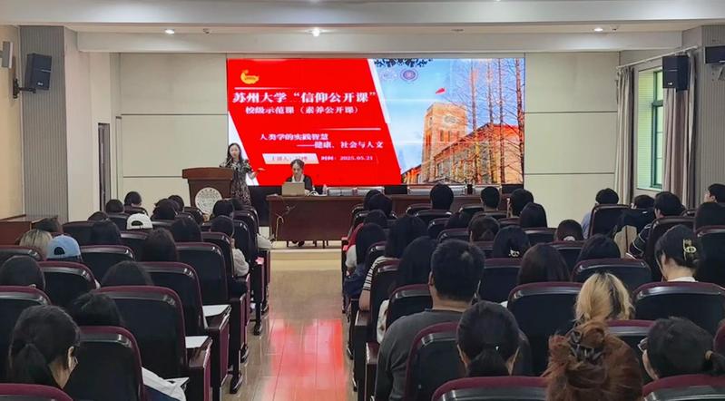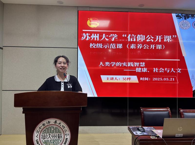 5月21日,我院在天赐庄校区崇远楼201会议室举行“人类学的实践智慧——健康、社会与人文”苏州大学“信仰公开课”校级示范课(“素养公开课”)活动。美国加州大学圣迭戈分校人类学博士、芬兰赫尔辛基大学博士后研究员、心理(医疗)人类学博士吴桦老师担任主讲嘉宾,东吴学院何芊蔚副教授担任本场讲座主持人,院团委书记陈晓宇、外国语学院副教授古海波出席活动。2025年苏州大学“青年马克思主义者培养工程”春季班学员、外国语学院“青年马克思主义者培养工程”春季班学员、学生骨干等参加活动。