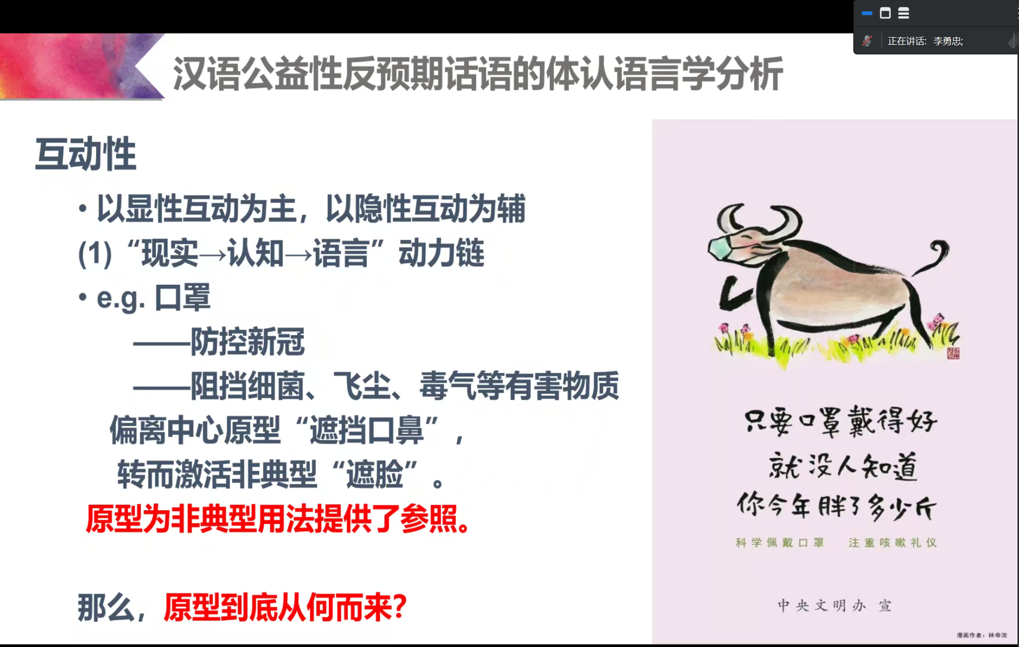 李勇忠教授基于详实的汉语公益性广告话语语料,运用体认语言学的核心原则 “现实(体)——认知(认)——语言”,结合互动性和映构性,阐释了公益性广告话语的反预期现象。李教授指出“小林漫画”公益性广告话语的鲜明特点是反预期性,其认知加工包括体认概念整合、隐转喻、交际双方的互动感知体验,体现在现实、认知和语言的双向互动,凸显了该类话语理解的体认性。
