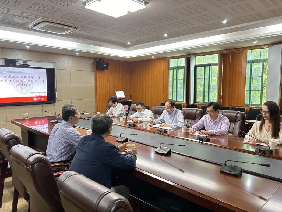 2023年5月17日下午,福建师范大学外国语学院葛桂录院长一行来到苏州大学外国语学院开展交流与调研,苏州大学外国语学院党委书记严冬生、院长朱新福、副院长王军、副院长孟祥春代表学院接待。