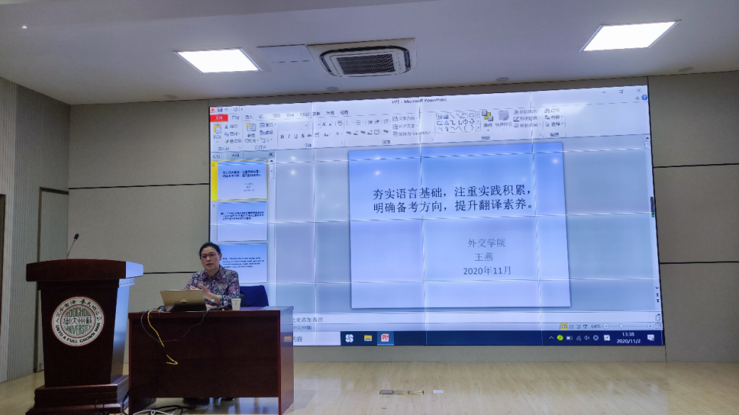 2020年11月2日,外交学院王燕教授、中国外文局翻译专业资格考评中心综合处徐菡主任与刘征副主任应邀来到外国语学院,先后为我院师生作了题为“夯实语言基础,注重实践积累,明确备考方向,提升翻译素养”、“CATTI全国翻译专业资格(水平)考试”与“翻译职称评审政策解读”的三场讲座。讲座由我院陈大亮教授主持。