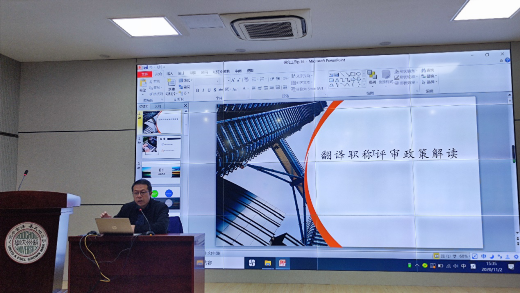 在第三场讲座中,刘征副主任为外院师生详细解读了翻译系列职称评审政策与翻译系列职称评审政策改革重点,依次介绍了翻译职称制度、各级职称的申报条件以及破格申报条件、委托要求、参评形式、业绩成果、研究重点、职能部门与翻译水平测试的研究方式。