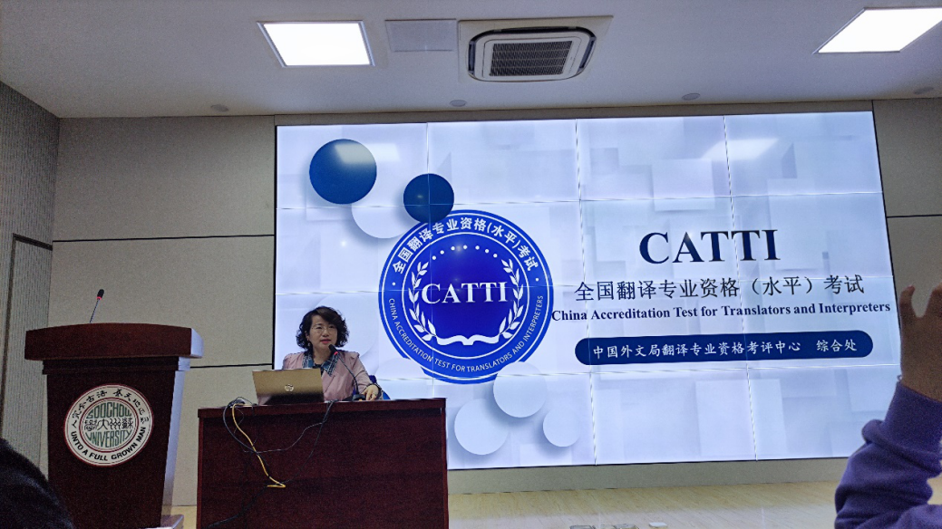 在第二场讲座中,外文局徐菡主任分别从CATTI设立的背景、CATTI证书的效用、CATTI考试的政策、CATTI发展的历程与CATTI产品与服务这五个方面对全国翻译专业资格(水平)考试展开了详细介绍。