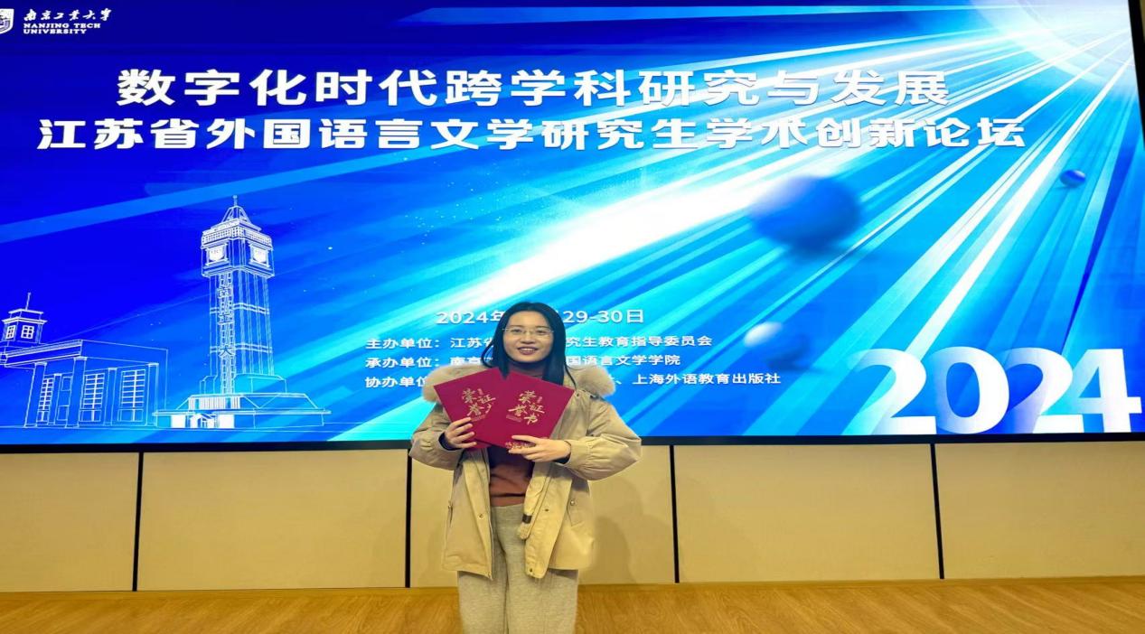 2024年11月29日-30日,2024年江苏省外国语言文学研究生“数字化时代跨学科研究与发展”学术创新论坛将在南京工业大学隆重举行。我院孟祥春副院长带领日语语言文学博士生黄睿、英语语言文学硕士生王海燕、亚非语言文学硕士生石宇、外国语言学及应用语言学硕士生张佳宁、沈自铮、陈柯汝六位同学参加。经专家匿名评审,黄睿的论文《流动、生成与写作——志贺直哉<在城崎>中的“逃逸”叙事》荣获论文特等奖和优秀汇报奖,沈自铮《中小学外语教师心理困扰潜类别与问题性网络使用》最佳汇报奖,石宇同学的论文《电影与文学的跨界耦合:李沧东小说接受中的审美惯性与文本回归》荣获优秀汇报奖,张佳宁、陈柯汝、王海燕三位同学获得了优秀论文奖。
