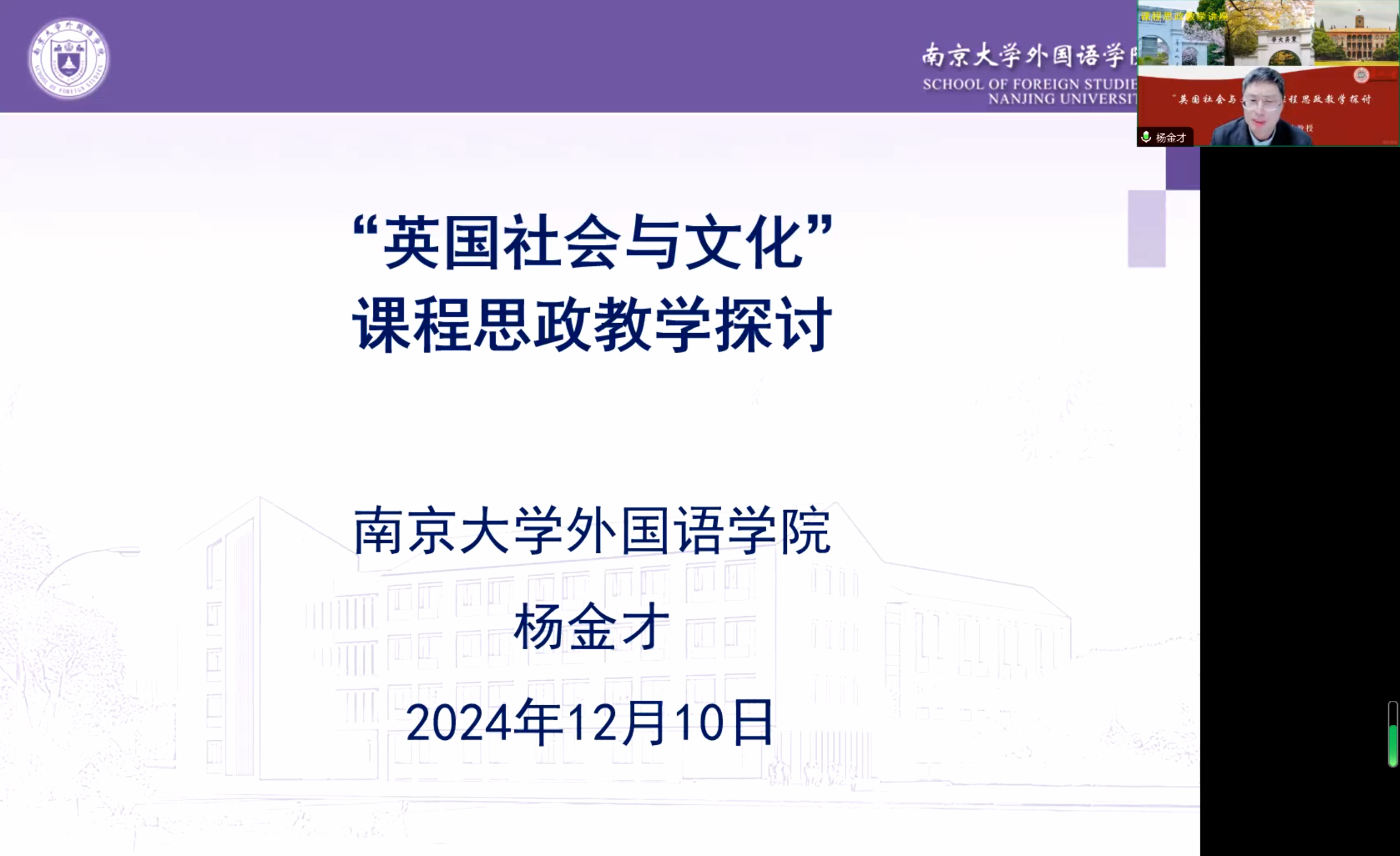 2024年12月10日晚,应苏州大学外国语学院邀请,南京大学外国语学院杨金才教授在线上做了一场题为“‘英国社会与文化’课程思政教学探讨”的讲座,会议由苏州大学宋艳芳教授主持,孟祥春教授总结并点评。该讲座是苏州大学外国语学院课程思政培训的一次重要活动,也是由杨金才教授主持的教育部“英语专业文学与文化课程群虚拟教研室”系列活动之一。