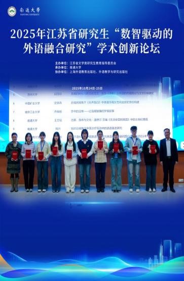 2025年10月24日-10月25日,2025年江苏省研究生“数智驱动的外语融合研究”学术创新论坛在南通大学隆重举行。本次论坛由江苏省文学类研究生教育指导委员会主办,南通大学承办,上海外语教育出版社、外语教学与研究出版社协办。