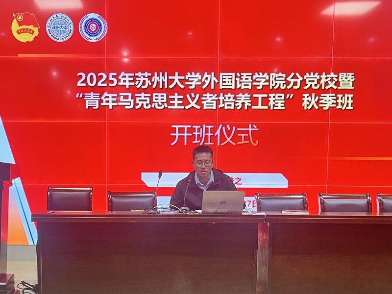 2025年10月27日18:30,2025年苏州大学外国语学院分党校暨“青年马克思主义培养工程”秋季班开班仪式顺利举行。全体受训成员到场参加,学院分党校校长、党委书记陶培之出席并授课。分党校秘书、学工办主任何渊主持开班仪式。