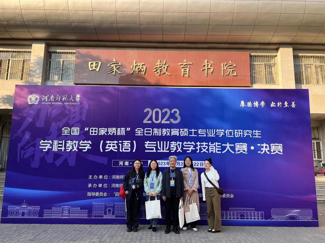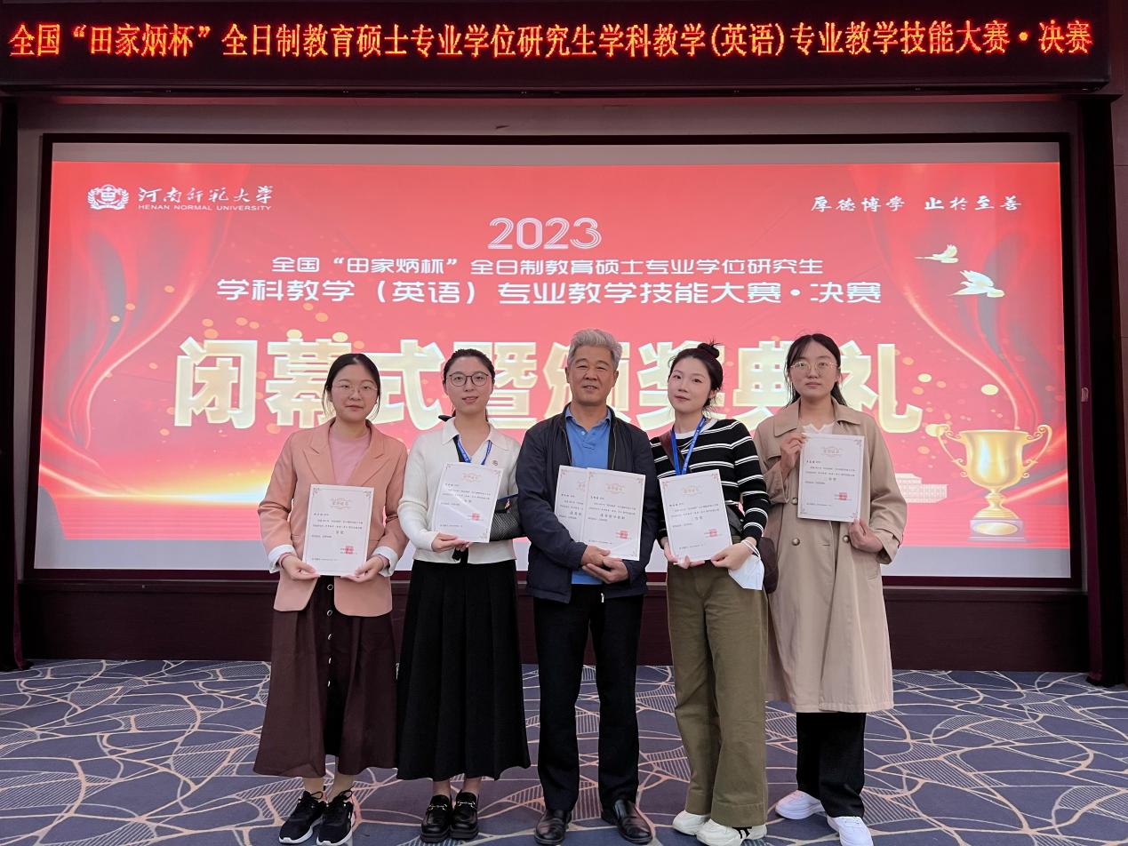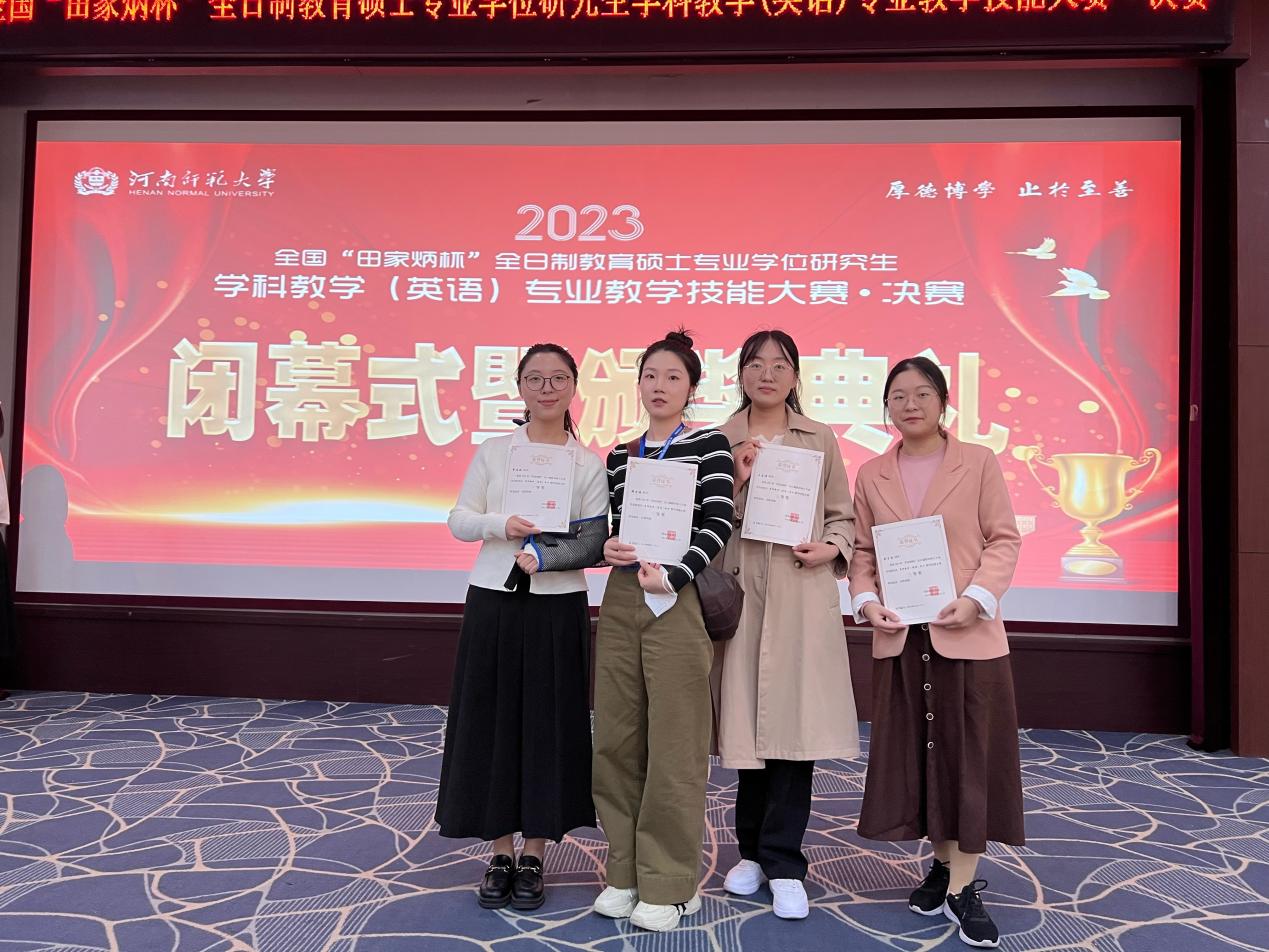 2023 年 10月22日,由全国教育专业学位研究生教育指导委员会主办的“田家炳杯”全国全日制教育硕士专业学位研究生教学技能大赛总决赛在河南师范大学落下了帷幕。苏州大学外国语学院 22 级学科教学(英语)专业四名研究生在高明强副教授带领下参加了此次决赛,并取得了优异成绩: 卓佳妹(指导教师高明强副教授) 获一等奖,郑思雅(指导教师衡仁权副教授)获二等奖,王昌娟(指导教师王海贞教授)、刘子怡(指导教师古海波副教授)分获三等奖,高明强副教授和衡仁权副教授获得优秀指导教师奖。