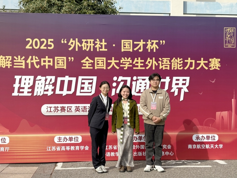 2025年11月1日至2日,“外研社·国才杯”“理解当代中国”全国大学生外语能力大赛英语组演讲赛项江苏赛区赛事在南京航天航空大学举行。大赛由北京外国语大学主办,外语教学与研究出版社承办。全省共173名选手参加了此次比赛。我院英语师范专业张磬悦同学获得一等奖并成功晋级国赛,翻译系张凯棋同学获得三等奖。