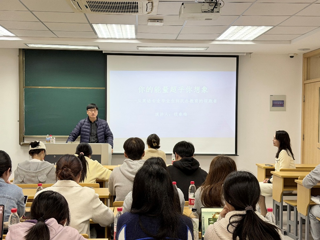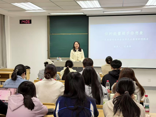 11月14日下午2:00,苏州大学外国语学院英语专业毕业生钱春梅校友在天赐庄校区博远楼205教室作了题为“你的能量超乎你想象——从英语专业毕业生到民办教育的领跑者”的专题讲座。本次讲座由外国语学院教工英文党支部书记莫俊华副教授主持。