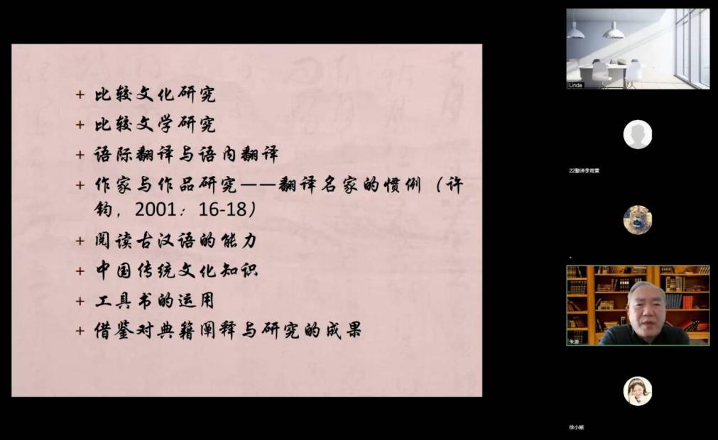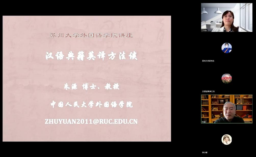 2023年11月22日下午,中国人民大学外国语学院朱源教授应邀为我院师生做了题为“汉语典籍英译方法谈”的讲座。本次讲座是我院省级重点研究基地“中国文化翻译与传播研究基地”的系列学术活动之一。讲座在腾讯会议平台举行,由我院张玲老师主持。