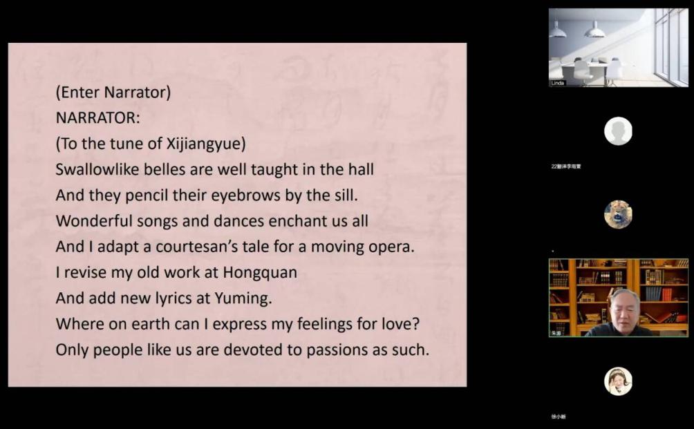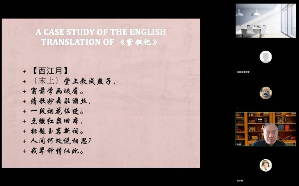 最后,朱教授以个人典籍英译实践为例,分享了他的心得体会:首先,要通过文献综述了解该领域的研究现状,然后确定研究方向;在具体的翻译过程中,不仅要读懂文本的意思,还要清楚其风格。译者应该以严谨的态度来理解文本,他以《紫钗记》中的“燕子”一词为例,说明了查阅工具书的重要性。
