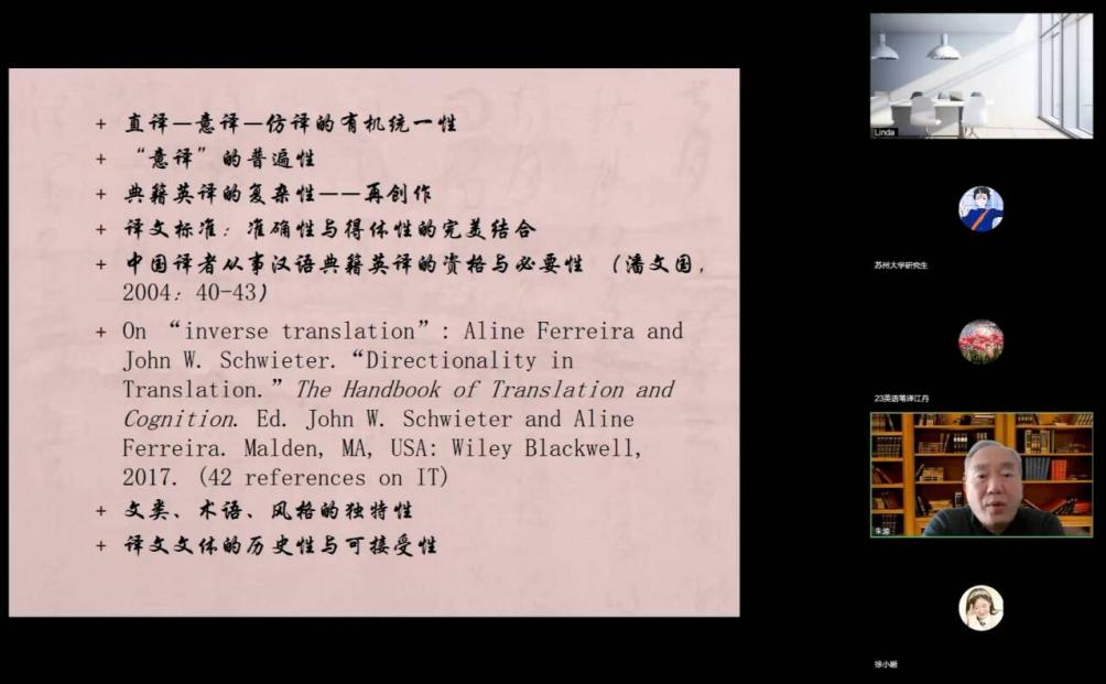 讲座伊始,朱教授讲到了自己师从汪榕培教授的经历,包括导师对其研究方向和研究方法的启发和指导。他还谈到汉语典籍英译的翻译原则,认为典籍翻译是一种再创作,具有其复杂性;在翻译中,译者需要具体情况具体分析。比如,直译、意译和仿译是有机统一的,并非割裂存在。他还谈到中国译者从事汉语典籍英译的资格和必要性:译者需广泛阅读英语文学,提高英语写作能力,以更好促进中国文化传播。