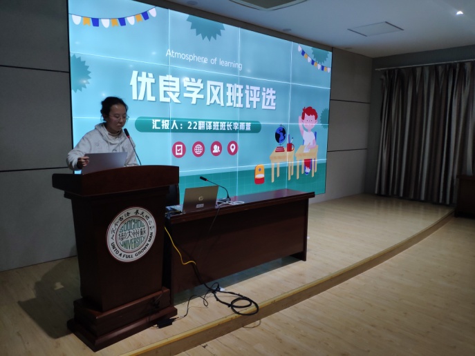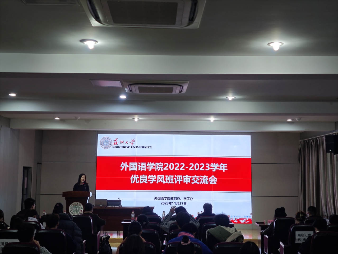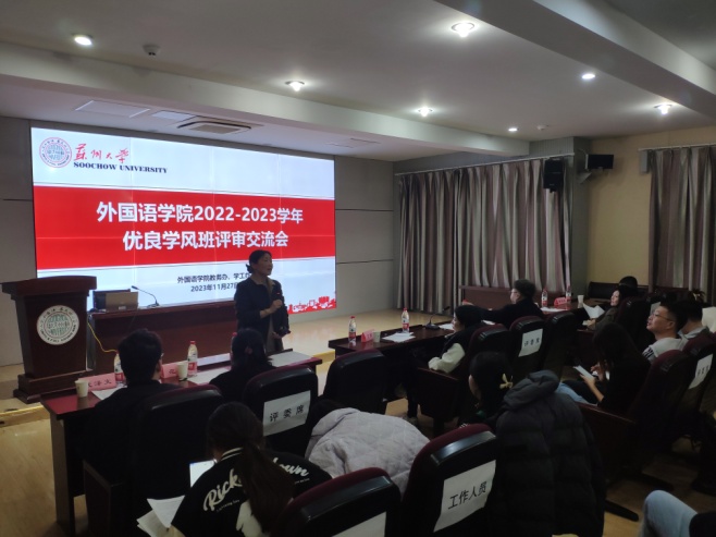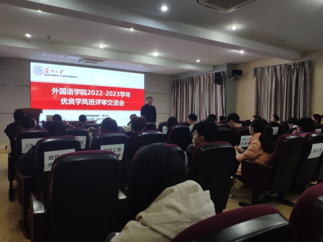 优良学风建设是我校育人工作中一项重要的基本建设,也是学校、学院回归大学本位,提升人才培养质量的重要举措。为进一步全面加强学风建设,促进班级间的相互交流学习,展示班级学风建设的优秀成果,外国语学院2022-2023学年优良学风班评选于11月27日晚在崇远楼201室顺利举行。出席本次活动并担任评委的老师有外国语学院党委副书记、副院长朱苏静老师、日文系系主任李东军老师、俄文系系副主任丁丽芬老师、翻译系陈丽娅老师、法文系武泽文老师、朝鲜语系洪艺花老师、西班牙文系孙玉良老师、教务办范立老师、辅导员代表何渊老师和郭斌老师,还有2021级、2022级和2023级部分班级学生代表也来到了活动现场,活动由学工办主任舒洪灶老师主持。