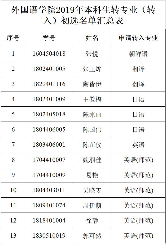 根据学校《关于开展苏州大学2019年本科生转专业工作的通知》(教字[2019]50号)要求,经报名申请、资格审核、笔试考核、面试考核等各环节,并最后经“外国语学院转专业工作小组”讨论,已确定外国语学院2019年本科生转专业(转入)初选名单,现予以公示(最终名单以学校公示为准)。联系人:庄宇峰,电话65243010。