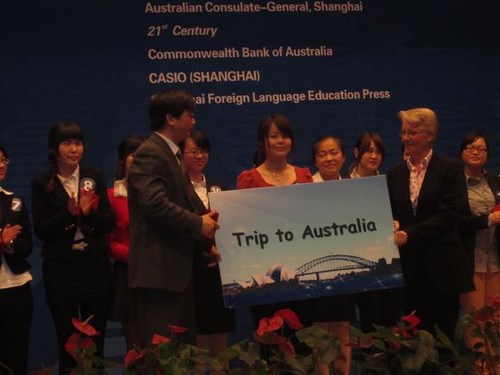 当日下午1点,比赛准时开始。在定题演讲、即兴演讲和澳洲知识问答三个环节中,来自各高校的优秀选手各显其能,其优美的语音语调、扎实的英语语言功底、敏捷的反应和丰富的知识获得了评委和观众的阵阵掌声。我校外国语学院的顾菲儿同学表现尤为突出,在定题演讲中,她以著名电影《澳大利亚》为切入点,讲述自己对澳大利亚的认识过程,她的演讲声情并茂,演讲完毕,台下掌声雷动。在即兴演讲中,她有理有据,生动活泼,给评委、专家留下了深刻的印象。在澳洲知识问答的环节中,由于前期的精心准备,她轻松地拿到满分。最终,顾菲儿同学以优异的成绩获得了大赛唯一的特等奖,将赴澳大利亚进行为期十天的访学。这是我校迄今为止在华澳杯比赛中获得的最好成绩。方红老师获得了“最佳指导教师奖”。我们对她们取得的优秀成绩表示衷心祝贺!