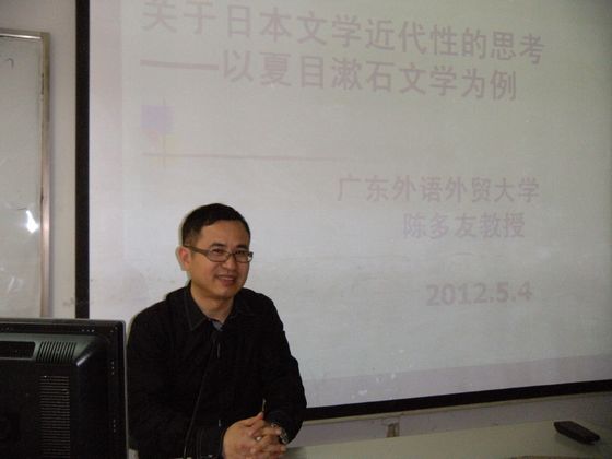 2012年5月4日,广东外语外贸大学东亚文化学院院长陈多友教授应邀来我院主持日语专业硕士研究生答辩工作并做学术报告。陈教授现任中国中日比较文学研究会(常务)理事、中国日本文学研究会(常务)理事、华南日本研究所学术委员、东京大学客座教授等职,主要研究方向为日本近现代文学研究及现当代文艺理论批评,研究成果丰硕。