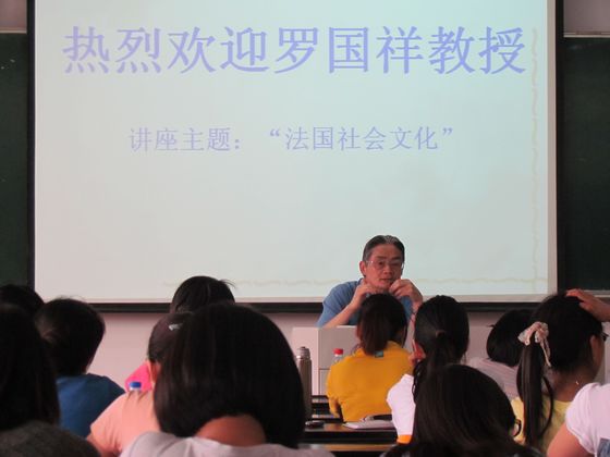 2012年5月15日,武汉大学外国语学院罗国祥教授应邀来我院讲学。罗教授为武汉大学外国语学院博士生导师、现任武汉大学法国问题研究中心主任、《法国研究》杂志主编、武汉大学欧洲研究中心学术委员会副主任、国家社科基金评审委员,主要研究方向为法语语言文学和法国社会文化,发表学术论文100余篇,出版各类专著、译著20余部。承担并完成中欧高等教育合作项目、法国国家科研中心基金项目、国家社科基金项目等共6项,1993年获国务院“政府特殊津贴”。