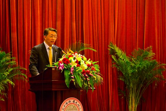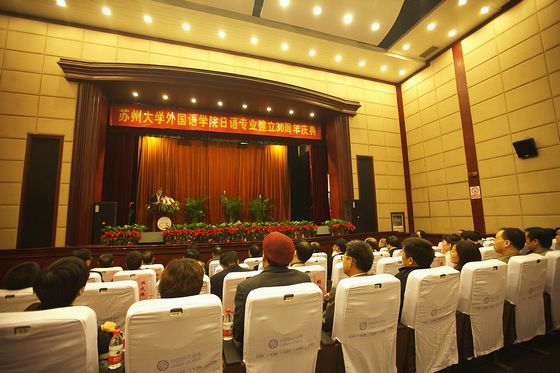 上午的庆祝大会在敬贤堂举行,由日语系副主任潘文东老师主持。校领导蒋星红副校长到会祝贺并致辞,她勉励和期望苏大外院日语系将来能够成为日语人才培养的基地和日本学研究的基地。王腊宝院长的讲话回顾了日语专业30年走过的历程,介绍了日语系教学、师资、科研、人才培养、国际交流等方面的情况,希望日语系在新的历史条件下进一步开拓进取,谱写学科建设和学位点建设的新篇章。中国日语教学研究会江苏分会汪平会长上台致词并向向日语系赠送了礼物。