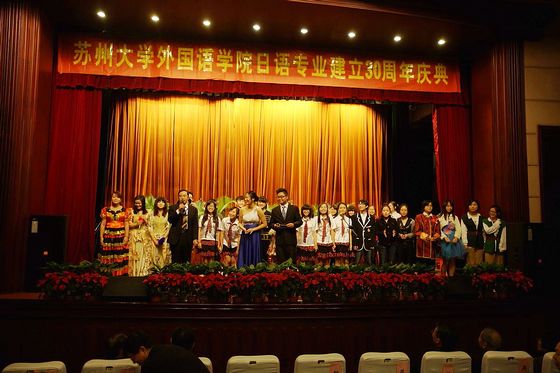 2012年11月4日,我院隆重举行了日语专业建立30周年庆典活动。当日,校、院两级领导、日语系广大师生以及受邀的日语专业创建时的老教师、江苏分会年会的外校嘉宾、各届校友、社会友好单位人士、外语学院老领导老辅导员和其他系科的师生们,欢聚一堂,共同见证了这一喜庆的时刻。