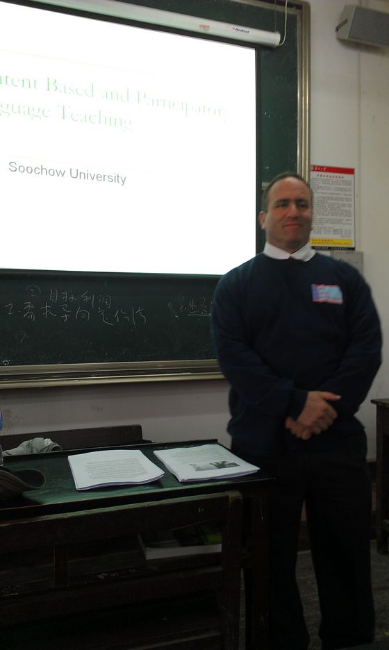 Bruce Applebaum老师来自美国波士顿大学,多年研究外语教学,曾在日本、朝鲜、印尼等国家成功举办过类似活动。在本次workshop中,Bruce Applebaum老师通过实例演示指出,内容教学法应始于具体材料而非单纯从语法入手,教师应选取对学生有意义的内容作为教学材料,在交流对话中达到语言教学的目的。Bruce Applebaum为大家介绍了参与式语言学习的概念及它的提出者巴西教育家及哲学家Paulo Freire,并通过一系列的讨论活动说明:参与式语言学习应选取与学生密切相关的话题,设计多种与话题相关的教学活动使学生能够自发且主动的参与其中,从而高效的达成教学目的。