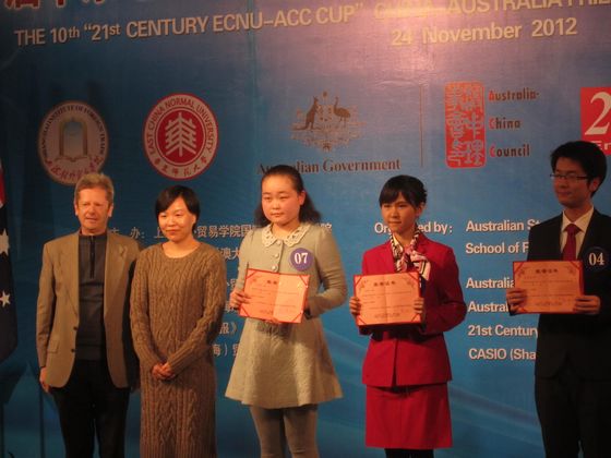 11月24日,第十届华东地区“21世纪・华澳杯”大学生中澳友好英语大赛在上海对外贸易学院松江校区举行。本次活动由华东师范大学澳大利亚研究中心、上海对外贸易学院主办,澳大利亚外交外贸部澳中理事会、澳大利亚驻上海总领事馆和《21世纪英文报》协办。来自南京大学、复旦大学、华东师范大学、山东大学、苏州大学等近20多所高校的选手展开了激烈的角逐。我院2010级英语(翻译)专业的张晓羚同学在方红老师的指导下参加了本次比赛。