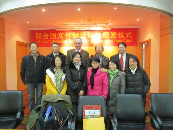 在证书颁发仪式上,王腊宝院长对杜加里克先生一行的来访表示欢迎。他介绍指出,从上世纪80年代开始,我院有多位毕业生先后在联合国相关机构中任职,因此我院与联合国之间颇有渊源,此外,他强调了我院对于联合国文件翻译项目的重视,指出在该项目运行的两年多时间里,我院师生精诚合作,在规定的时间里圆满完成了近20万字的联合国文件的翻译工作,译文质量得到了联合国中文处的高度认可。
