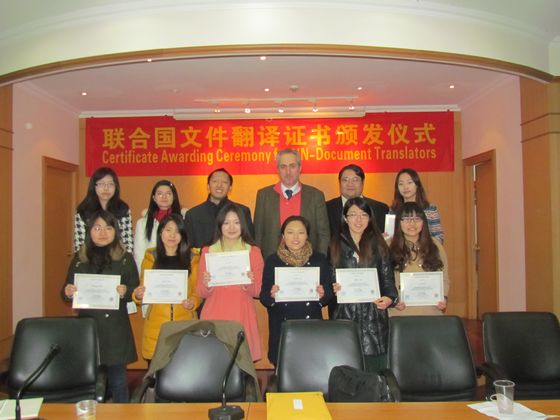 在双方致辞之后,杜加里克先生亲自为获得联合国文件翻译证书的2011级MTI专业的12位学生颁发了证书。之后,2011级获奖学生代表陈林同学结合自己一年多翻译联合国文件的经历和感受进行了发言。他认为,翻译联合国文件难度大,不容易做好,所以只能本着精益求精的态度,通过相互交流学习、精诚合作,才能把这项翻译工作做得好好;同时,通过这样的翻译实践活动,无论是在对于联合国的认识理解方面,还是翻译能力方面,他都得到了极大的收获。随后,2012级MTI专业的学生代表范立同学也谈了她的翻译体会。她认为,通过参与这样的翻译实践活动,她体会到细心、耐心以及恒心是成为一名优秀译员的必要条件,以及要完成像联合国文件翻译这样大型的翻译工作,合作的重要性不言而喻。此外,通过翻译联合国文件,她对于国际形势以及联合国各机构的工作也有了更深入的了解。
