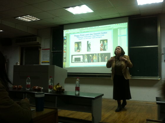 Hermann-Paul女士在报告中总结其多年来与德国及欧洲其他国家剧作家的交流经验,以及其自身作为作家的亲身经历,向我院德语系师生展示了当代德国著名的剧作家及其作品。Ulrik Hermann-Paul女士结合这些戏剧上演的真实图片,向我们形象而具体地介绍了Dea Loher、Mariana Salzmann、Nis-Momme Stockmann等多位优秀剧作家以及Diebe、 Schwimmen Lernen、 Kein Schiff wird Kommen等多部广受欢迎的戏剧作品,并结合了一些优秀作品的著名选段,详细地介绍了德国戏剧作品的特色和内涵,展示了德国戏剧艺术的独特魅力。