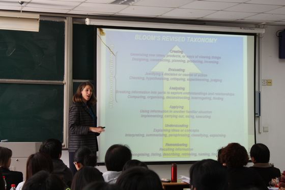 讲座在Newman先生风趣幽默的开场白中拉开序幕,现场欢声笑语,掌声不断,观众与主讲专家互动频繁,会场气氛十分活跃。Newman先生独特的二语教学方法和思维启发教学模式让在场的师生实际感受到了Newman先生对二语教学的定义。Rhoade博士的讲座也通过一个个真实的事例,向观众解释了创新性思维和批判性思维诸多要点和理念,思路清晰明确,现场气氛愉悦轻松,观众收获甚多。三个小时的讲座在不知不觉中到了尾声。师生们依然意犹未尽,讨论声和热烈的掌声在会场上久久不停。