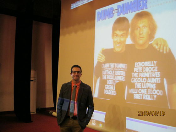 活动即将开始,陆续进入会场的同学们就惊喜地发现,本次活动所介绍的电影,是经典的美国喜剧《阿呆与阿瓜 (Dumb & Dumber)》。舞台的荧幕上放映着这部电影的海报,夸张搞笑的画面令人忍俊不禁。
