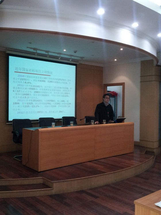 王克非教授是教育部人文社科项目和国家社科基金项目评审专家,在科研项目的设计和申请方面具有丰富经验。王教授首先和大家分享了自己的项目申报经历,特别指出科研项目的成功立项往往并不是一次就能成功的,需要“机遇加坚持”,尤其是后者,只有把自己的研究做好了,才能有所积累,也才有成功的希望。王教授鼓励在座的青年学者要能潜心做学问,加强研究基础,同时要善于向前辈、同行求教,听取他人意见,从而不断完善自己的项目申请书。在讲座中,王教授还对目前国内主要人文社科项目的特点以及申请和评审流程做了概括,并着重介绍了近几年来语言学的立项情况。最后,他就科研项目的申请要点进行了重点分析,他认为选题至关重要,好的选题体现了申请人的学术视野,反映了本学科的前沿研究领域,能够迅速吸引评审专家的注意力。其次是做好论证,因为好的题目需要进行有效的论证以及相关研究基础。
