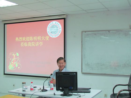 2013年6月7日下午,中国翻译协会副会长、我国驻新西兰、瑞典前任大使、著名外语专家陈明明先生应邀来我院讲学。陈明明大使1977年毕业于北京外国语学院英语系并进入外交部工作,1981年在美国Fletcher School of Law and Diplomacy获硕士学位,拥有丰富的外事翻译和外交经验,现于外交部翻译室负责英文定稿工作。