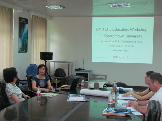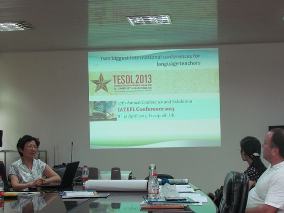 6月19日下午,外国语学院教学研究所在崇远楼会议室举办了“英语教学与教师发展”圆桌会议。来自英语系、翻译系、大学外语部等部门近二十位老师参加了本次会议。会议首先由美国专家Bruce Applebaum先生总结了过去一学年他为我院师生组织的系列学术讲座,并介绍了下一年度的讲座计划。参会老师也向下一年度的讲座话题提出了一些具体建议。会议第二部分由顾佩娅教授介绍她参加本年度的TESOL年会的经历,顾佩娅老师跟大家分享了她申请参会的经验和收获,并深鼓励年轻英语教师积极投身英语教学研究,争取有更多的老师能参加TESOL和IATEFL这样高水平国际性的英语教学会议。会议第三部分由高永晨教授介绍她今年三月参加美国Georgetown University教学培训的经历,高老师不仅介绍了自己的学习经历,而且还把自己学习中所得的体会和感悟与参会的年轻老师分享。高永晨老师的课题演示以及她所介绍的美国专家的研究项目给大家留下了深刻的印象,对大家具有重要的指导意义。会议最后,Bruce Applebaum先生还向参会老师介绍了美国大使馆所赠书籍的使用方法。