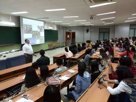 在讲座中,Bruce Applebaum老师向大家详细介绍了美国高等教育的现行体制、一些知名大学的历史和特色,以及申请美国大学,特别是研究生课程的主要条件和步骤等。讲座结束后,他还和沈鞠明老师一起就学生提出的问题给予了认真的回答,并为他们提供了相关的留学信息。