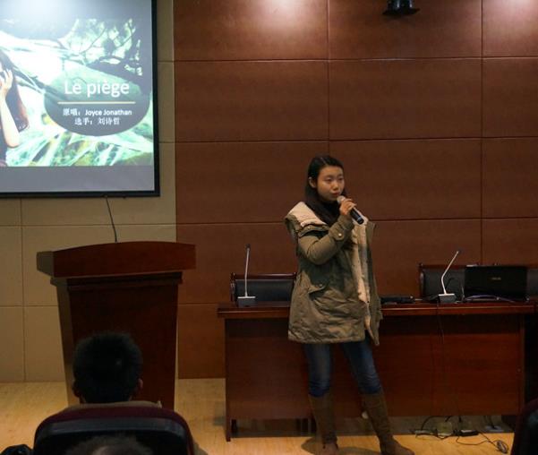 主持人开场词一结束,激动人心的法语唱歌比赛便拉开了帷幕。首先登场的是13级的新生崔尧同学,他演唱的歌曲是《Toi plus moi》。动人的嗓音,自信的微笑带来漂亮的“开门红”。随后的选手们舞台表现愈加出色,举止大方得体,毫无怯场之势。刘诗哲同学演唱的《Le piège》,吐词清晰,节奏准确,得到评委们一致的赞许。大二的郝明慧同学一曲《Poupée de cire poupée de son》十分具有感染力,动感的节奏,热辣的舞蹈动作赢得现场观众阵阵掌声。十名选手演唱完后,同学们意犹未尽。在大家的盛邀之下,上届法语歌曲大赛冠军张荣瑾同学一展歌喉,又让大家饱了一回耳福。经过得分统计,2011级王宁同学和2013级刘诗哲同学分别以91.8和90.6的高分荣获前两名,也取得了明年3月代表苏州大学参加上海赛区法语歌曲比赛决赛的资格。随后,薛曦老师对本次活动做了点评,薛老师高度评价了各位参赛同学的精彩表演,很欣赏同学们能够自信大方地站在舞台上进行演唱,用美妙的歌声来演绎法国文化。