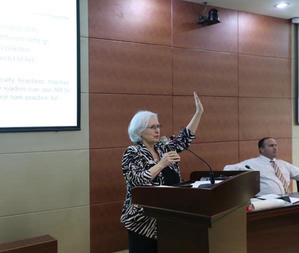 Dr.Adamson是约翰•霍普金斯大学(Johns Hopkins University)教育学院副教授,擅长行动研究以及教师培训。Dr.Adamson 首先简要介绍了行动研究的发展历史和相关的背景知识(如教师的教学水平及其影响因素)。然后,Dr.Adamson举例介绍了不同国家在不同的情境中应用行动研究的相关情况,并分享了相关网址,让我们知道如何将行动研究应用于教学实践中。接着,Dr.Aadamson 详细介绍了实施行动研究的具体方法和8个步骤,包括这一模型为教师运用行动研究检验特定情境下自己的教学成果提供了实践框架。参会的老师们也听得非常认真,积极思考,结合自己的教学经验理解行动研究,向Dr. Adamson提出自己在教学中的一些困惑,Dr.Adamson也一一作了详细解答。