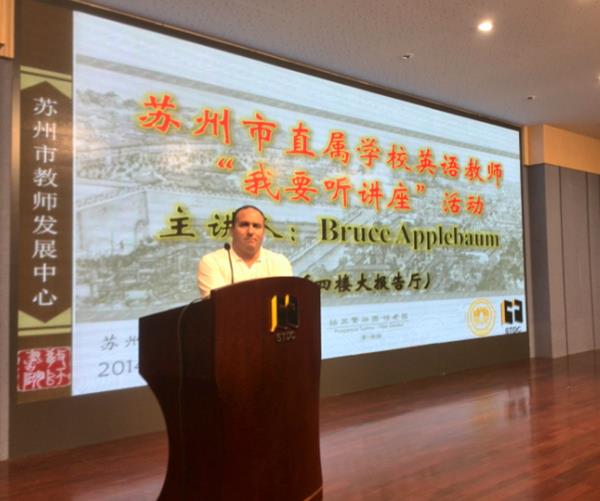 3月25日晚,我院美籍教师Bruce Applebaum先生在英文系沈鞠明老师的陪同下前往苏州市教师发展中心开展讲座。讲座的题目为“Critical Thinking for Language Teaching”(思辨能力与语言教学)。来自苏州市教育局直属学校的近四百名英语教师参加了讲座。